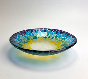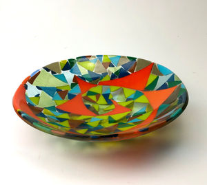 There are countless ways to create a pattern or design for fused bowls and your design can be random, geometric, abstract or representational. You will be able to create your design using opaque, transparent or a glass mix of your choosing.